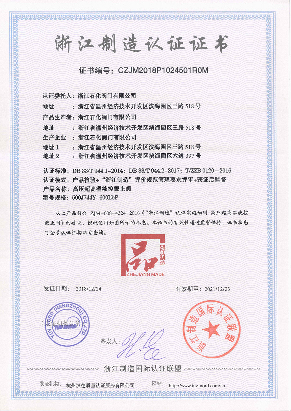 我公司于2018年12月通過了《高壓超高溫液控截止閥》的浙江制造認(rèn)證證書,為了深入推進(jìn)“三強(qiáng)一制造”建設(shè),打響“品字標(biāo)浙江制造”品牌,浙江制造推行了“品字標(biāo)”企業(yè)“四個百分百”計劃,努力實現(xiàn)“品字標(biāo)”企業(yè)廠區(qū)車間100%亮標(biāo)、質(zhì)量承諾100%公示、品牌產(chǎn)品100%貼標(biāo)、廣告宣傳100%植入,以此不斷提升“品字標(biāo)”品牌的社會知名度、認(rèn)可度和美譽(yù)度。